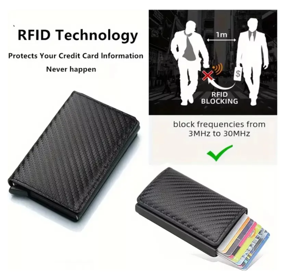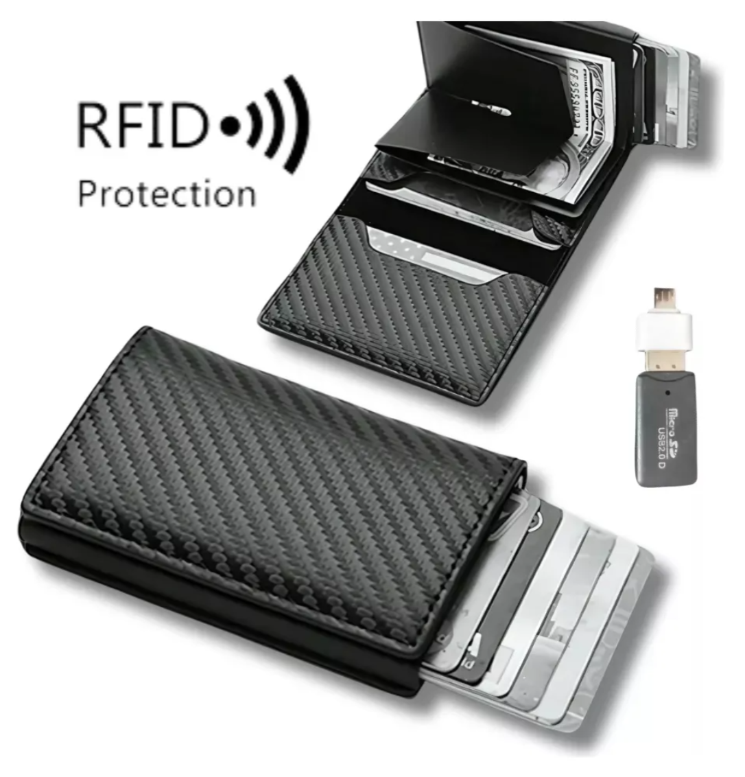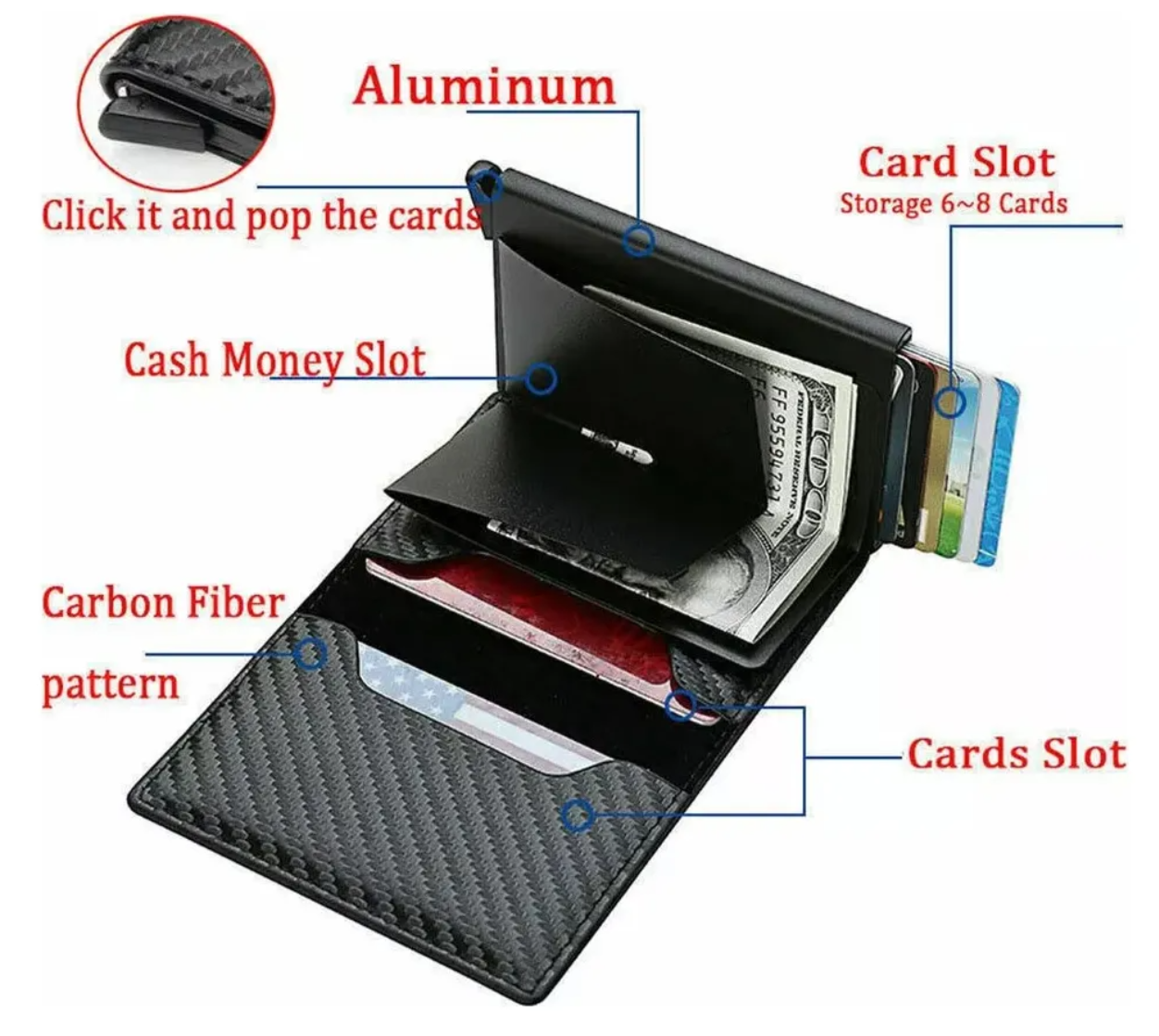 DISEÑO DELGADO CON ESTILO: la billetera del tamaño de la palma de la mano cabe fácilmente y de forma segura en su bolsillo y mientras viaja, perfecta para el uso diario Rápido: presione el botón a continuación para eliminar las tarjetas de una manera limpia y elegante, lo que le brinda acceso con una sola mano a cualquier tarjeta.