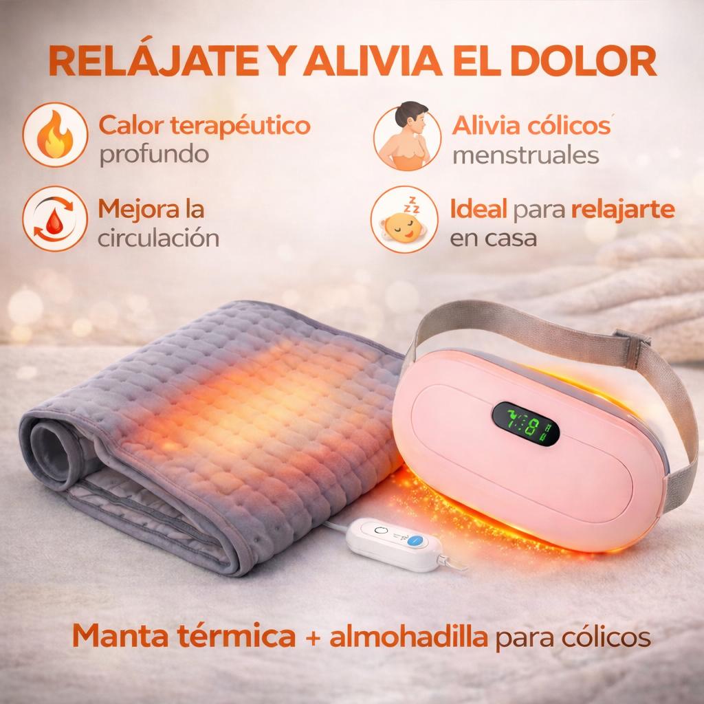 Este poderoso Combo de Bienestar Térmico incluye una manta térmica eléctrica y una almohadilla portátil para cólicos, diseñadas para proporcionar calor profundo que ayuda a relajar músculos, aliviar cólicos menstruales y reducir molestias corporales rápidamente.